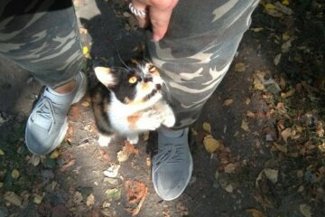 Ein Kätzchen namens Käferchen kam ganz zufällig in die Familie der Freiwilligen. Als sie zum Laden gingen, hörten sie ein entferntes Miauen und konnten nicht vorbeigehen. Nachdem das Ehepaar nach der Katze gerufen hatte, sah es, wie der pelziger Findling aus dem Gebüsch sprang und sich buchstäblich an ihren Füßen festhielt, sich schließlich auf einem Schuh setzte und ihn mit ihren kleinen Pfoten umarmte.